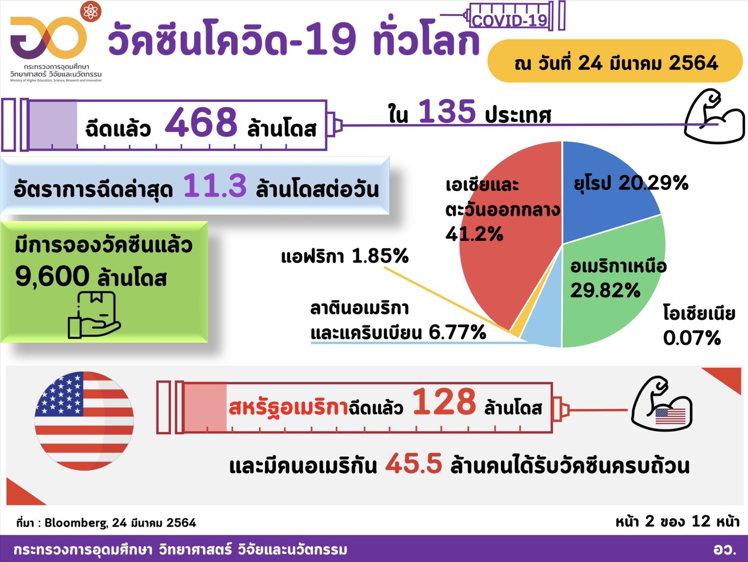1. การฉีดวัคซีนถึง 468 ล้านโดส ใน 135 ประเทศ และมีอัตราการฉีดวัคซีนล่าสุด 11.3 ล้านโดสต่อวัน มีการจองวัคซีนแล้ว 9,600 ล้านโดส
