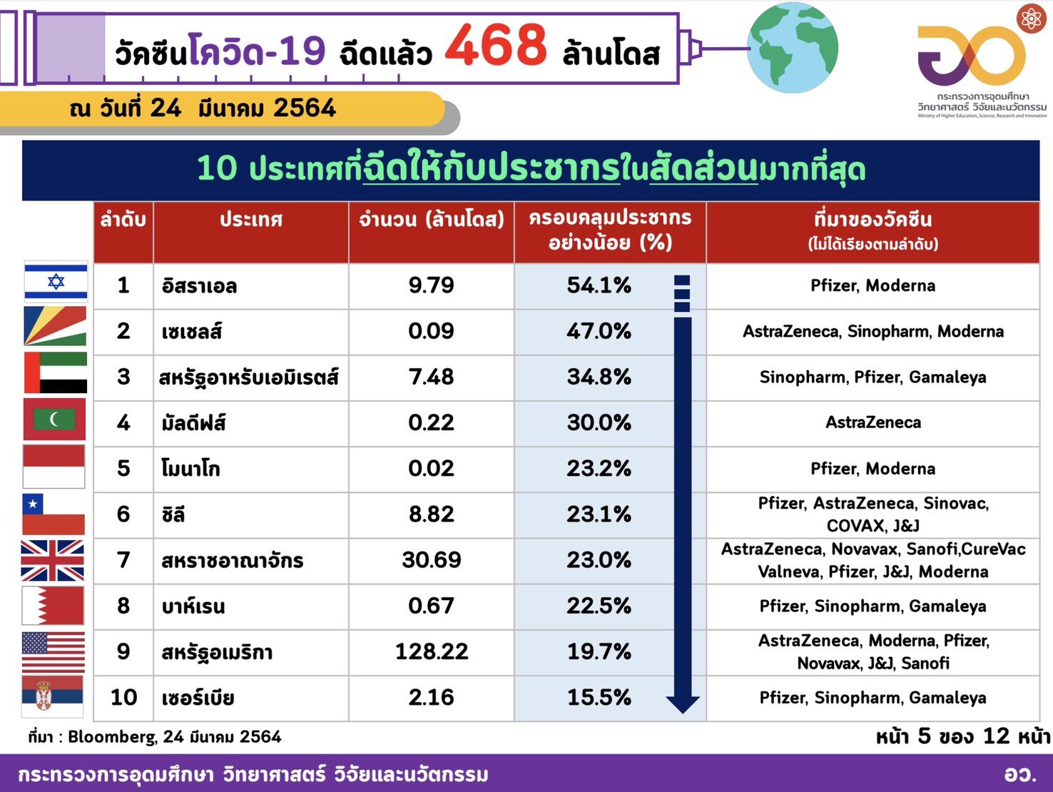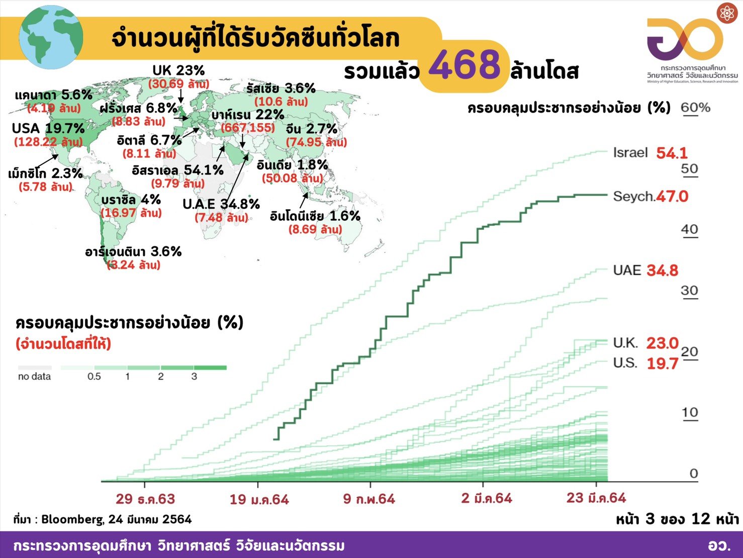 แหล่งข้อมูล Bloomberg Vaccine Tracker, Our World in dataประมวลข้อมูลโดย กระทรวงการอุดมศึกษา วิทยาศาสตร์ วิจัยและนวัตกรรม (อว.)