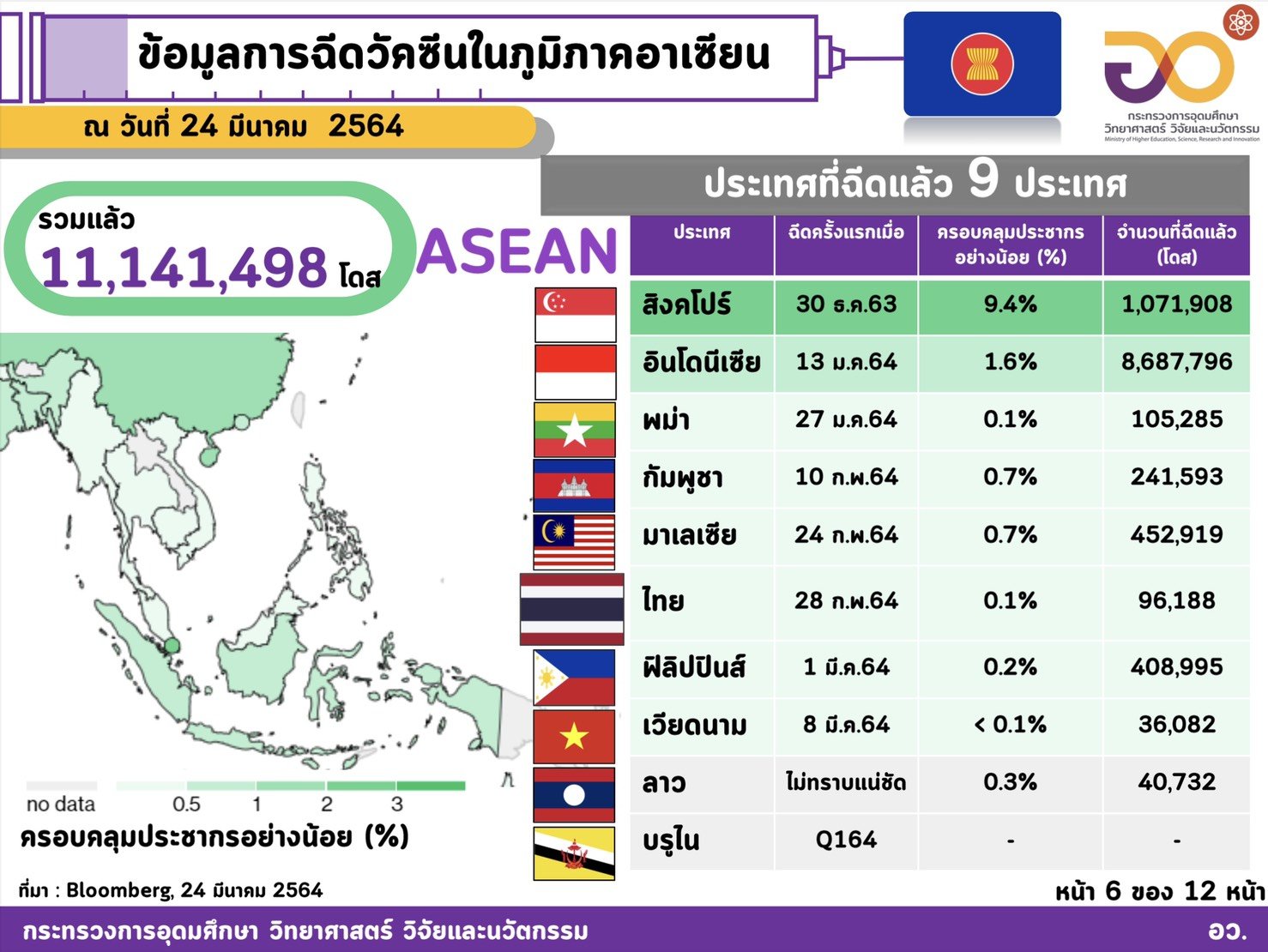 5. ในภูมิภาคอาเซียน ได้ฉีดวัคซีนแล้ว 11,141,498 โดส ใน 4 ประเทศ ได้แก่
