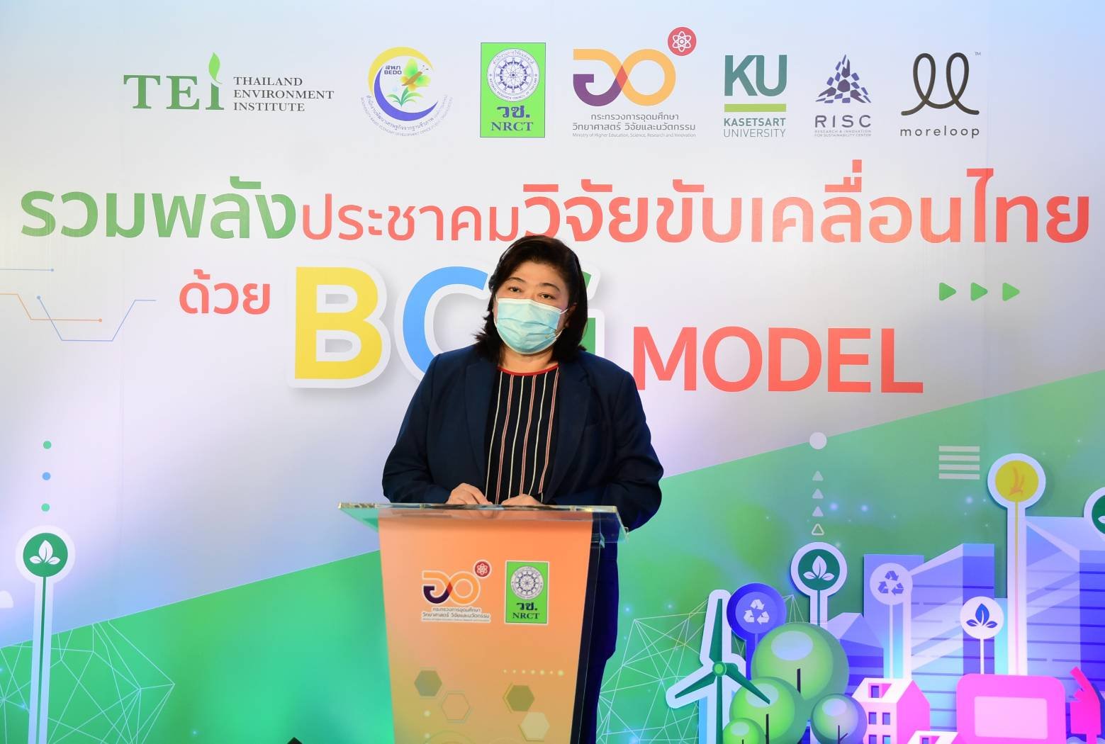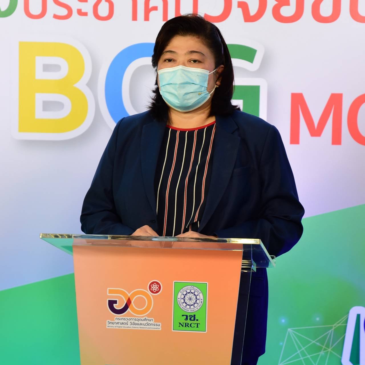 เมื่อวันอังคารที่ 18 พฤษภาคม 2564 ดร.วิภารัตน์ ดีอ่อง ผู้อำนวยการสำนักงานการวิจัยแห่งชาติ ร่วมเปิดการเสวนา “รวมพลังประชาคมวิจัยขับเคลื่อนไทยด้วย BCG Model” กล่าวว่า วช. ในบทบาทการบริหารจัดการทุนวิจัยและนวัตกรรมเพื่อตอบโจทย์ท้าทายของสังคม โดยในประเด็นท้าทายด้านทรัพยากร สิ่งแวดล้อม และการเกษตร ได้รับงบประมาณจากกองทุน ววน. เพื่อขับเคลื่อนการวิจัยและนวัตกรรมในการจัดการกับปัญหาเร่งด่วนสำคัญของประเทศในด้านทรัพยากรธรรมชาติและสิ่งแวดล้อม การเกษตร และเพื่อบรรลุเป้าหมายการพัฒนาที่ยั่งยืนด้วยทรัพยากรธรรมชาติและสิ่งแวดล้อมเป็นต้นทุนสำคัญในการพัฒนาเศรษฐกิจของประเทศ การใช้โมเดลเศรษฐกิจใหม่ที่เรียกว่า “BCG Model” ซึ่งเป็นการพัฒนา 3 เศรษฐกิจ คือ เศรษฐกิจชีวภาพ (Bioeconomy) เศรษฐกิจหมุนเวียน (Circular Economy) และเศรษฐกิจสีเขียว (Green Economy) ไปพร้อมๆ กัน เพื่อให้เกิดการขับเคลื่อนประเทศไทยอย่างเป็นรูปธรรม ทั้งนี้ BCG Model มีความสอดคล้องกับเป้าหมายการพัฒนาที่ยั่งยืน (SDGs) และสอดรับกับหลักการของปรัชญาเศรษฐกิจพอเพียง (SEP) ซึ่งเป็นหลักสำคัญในการพัฒนาเศรษฐกิจและสังคมของประเทศไทย และเป็นไปตามยุทธศาสตร์ของกระทรวง อว. ที่ได้กำหนดยุทธศาสตร์การขับเคลื่อนการพัฒนาประเทศไทย ด้วยโมเดลเศรษฐกิจ BCG พ.ศ.2564-2569 ที่มีเป้าหมายให้เศรษฐกิจเติบโตอย่างมีคุณภาพและยั่งยืน ประชาชนมีรายได้ดี คุณภาพชีวิตดี รักษาและฟื้นฟูฐานทรัพยากรและความหลากหลายทางชีวภาพใหม่คุณภาพที่ดี ด้วยการใช้ความรู้ เทคโนโลยี และนวัตกรรม