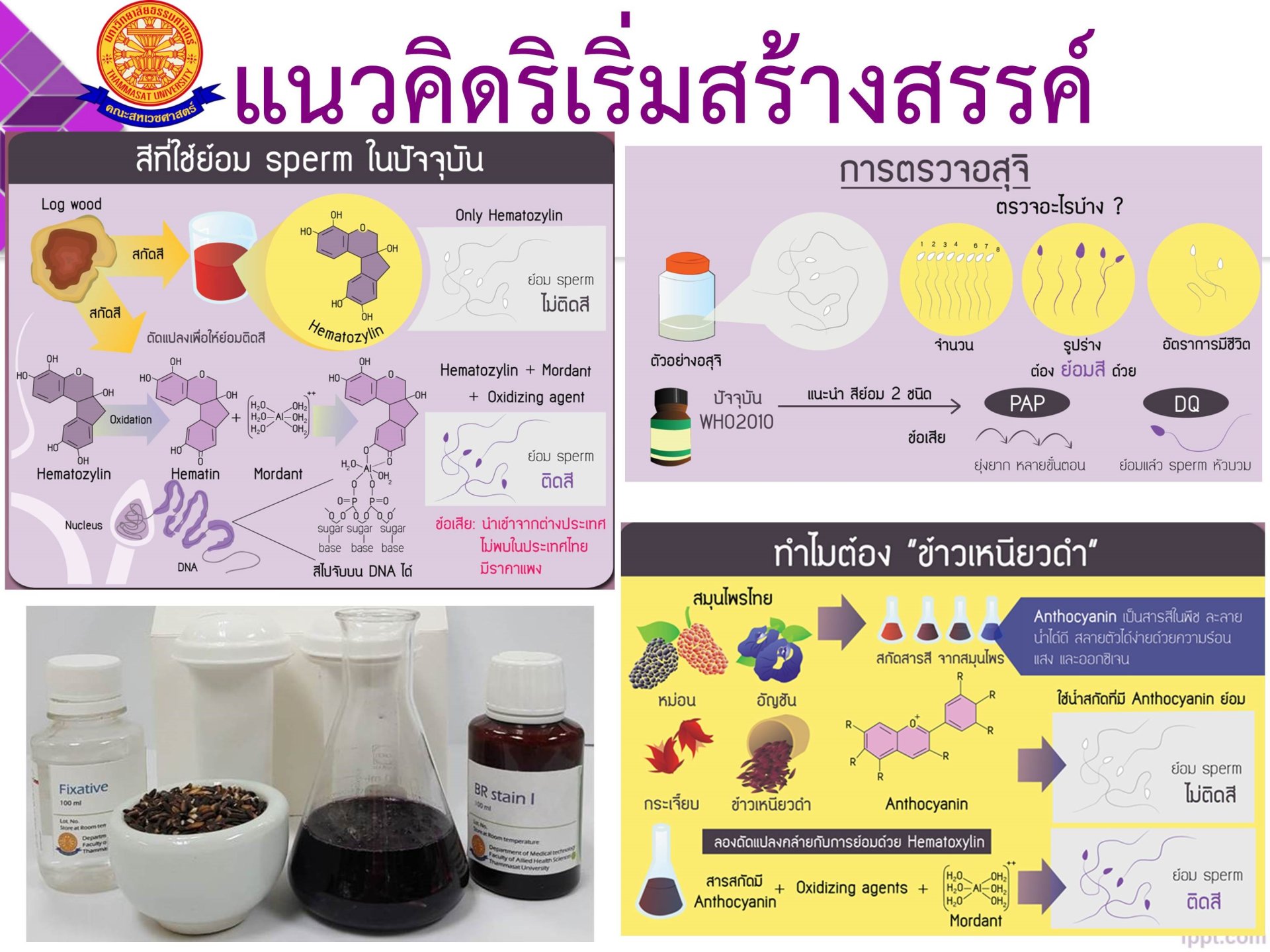 ผศ.ดร.ฌลณต เกษตร และผศ.ดร.สิรินารถ ชูเมียน นักวิจัยผู้คิดค้น เปิดเผยว่า การตรวจน้ำอสุจิในเพศชายเป็นส่วนหนึ่งในการเรียนการสอนวิชาจุลทรรศนศาสตร์ เป็นการคัดกรองเบื้องต้น เพื่อวิเคราะห์สภาวะการมีบุตรยากในเพศชาย ประเมินความสมบูรณ์ สัดส่วน รูปร่าง รวมถึงการเคลื่อนที่และจำนวนของอสุจิ ซึ่งจะต้องใช้สีย้อมในการตรวจดู แต่เนื่องจากสีย้อมนำเข้ามีราคาแพง ใช้งานยุ่งยาก และใช้เวลานาน ประกอบกับมีสารเคมีสังเคราะห์ที่ส่งผลกระทบต่อสุขภาพของผู้เรียนหรือผู้ใช้งาน ดังนั้น จึงได้พัฒนาชุดสีย้อมอสุจิจากสารสกัดธรรมชาติขึ้น โดยเลือกใช้ข้าวเหนียวดำเป็นส่วนประกอบสำคัญ ซึ่งหาได้ง่ายโดยทั่วไป มีความปลอดภัย ใช้งานง่าย และช่วยเพิ่มมูลค่าให้ข้าวไทยอีกทางหนึ่ง