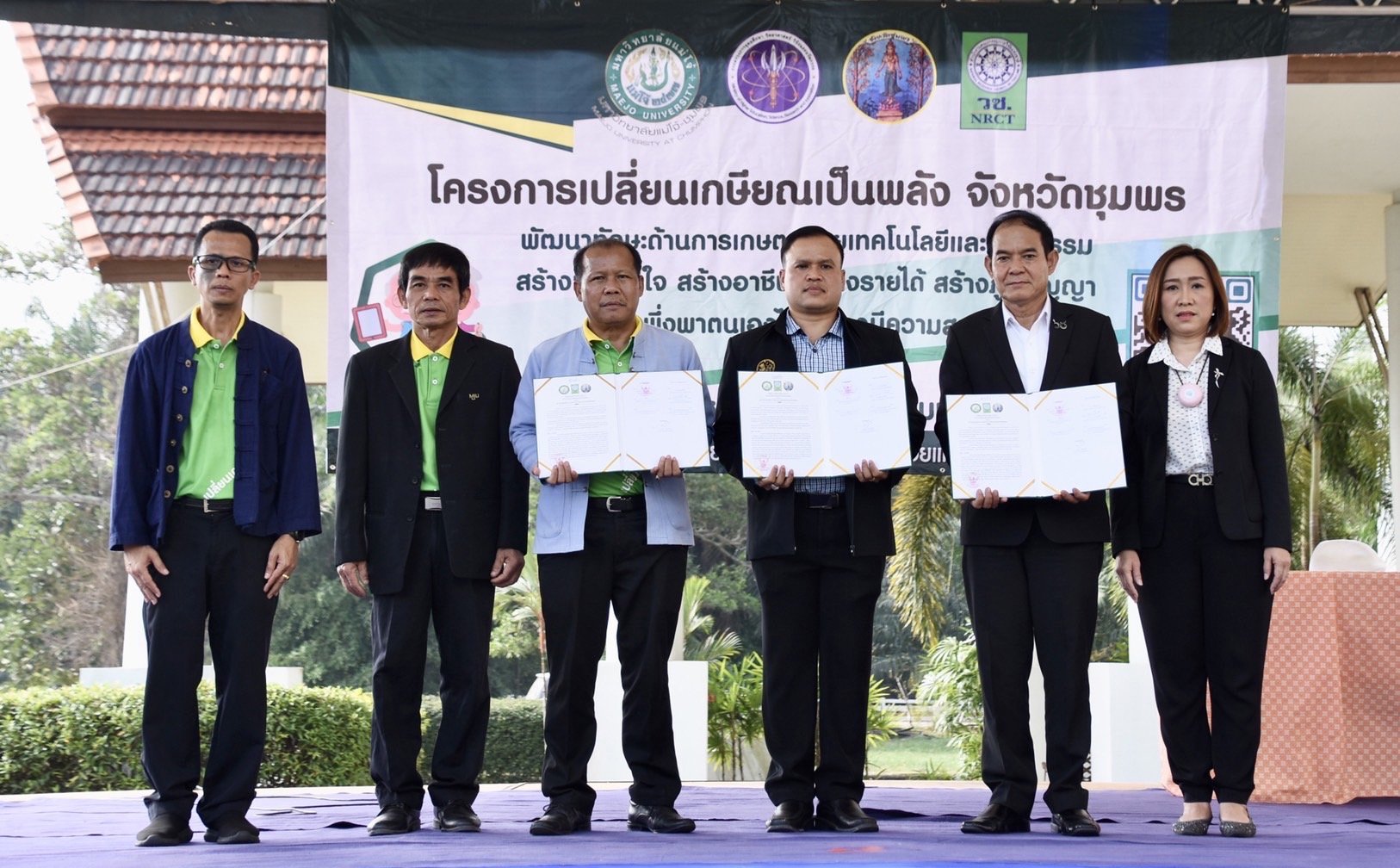 วันที่ 10 มกราคม 2566 สำนักงานการวิจัยแห่งชาติ (วช.) กระทรวงการอุดมศึกษา วิทยาศาสตร์ วิจัยและนวัตกรรม (อว.) ร่วมกับ จังหวัดชุมพร และมหาวิทยาลัยแม่โจ้ - ชุมพร จัดพิธีลงนามบันทึกความร่วมมือทางวิชาการ “โครงการเปลี่ยนเกษียณเป็นพลังจังหวัดชุมพร ระหว่าง มหาวิทยาลัยแม่โจ้ กับ สำนักงานการวิจัยแห่งชาติ และจังหวัดชุมพร” เพื่อขับเคลื่อนแผนงาน “เปลี่ยนเกษียณเป็นพลัง เฟส 2” โดย ดร.วิภารัตน์ ดีอ่อง ผู้อำนวยการสำนักงานการวิจัยแห่งชาติ มอบหมายให้ นายเอนก บำรุงกิจ รองผู้อำนวยการสำนักงานการวิจัยแห่งชาติ ร่วมลงนามกับ นายนิรัช โอบอ้อม ปลัดอำเภอละแม และ ผศ.ดร.ณัฐวุฒิ ดุษฎี รองอธิการบดีมหาวิทยาลัยแม่โจ้ ณ อาคาร 80 ปี มหาวิทยาลัยแม่โจ้ - ชุมพร จ.ชุมพร
