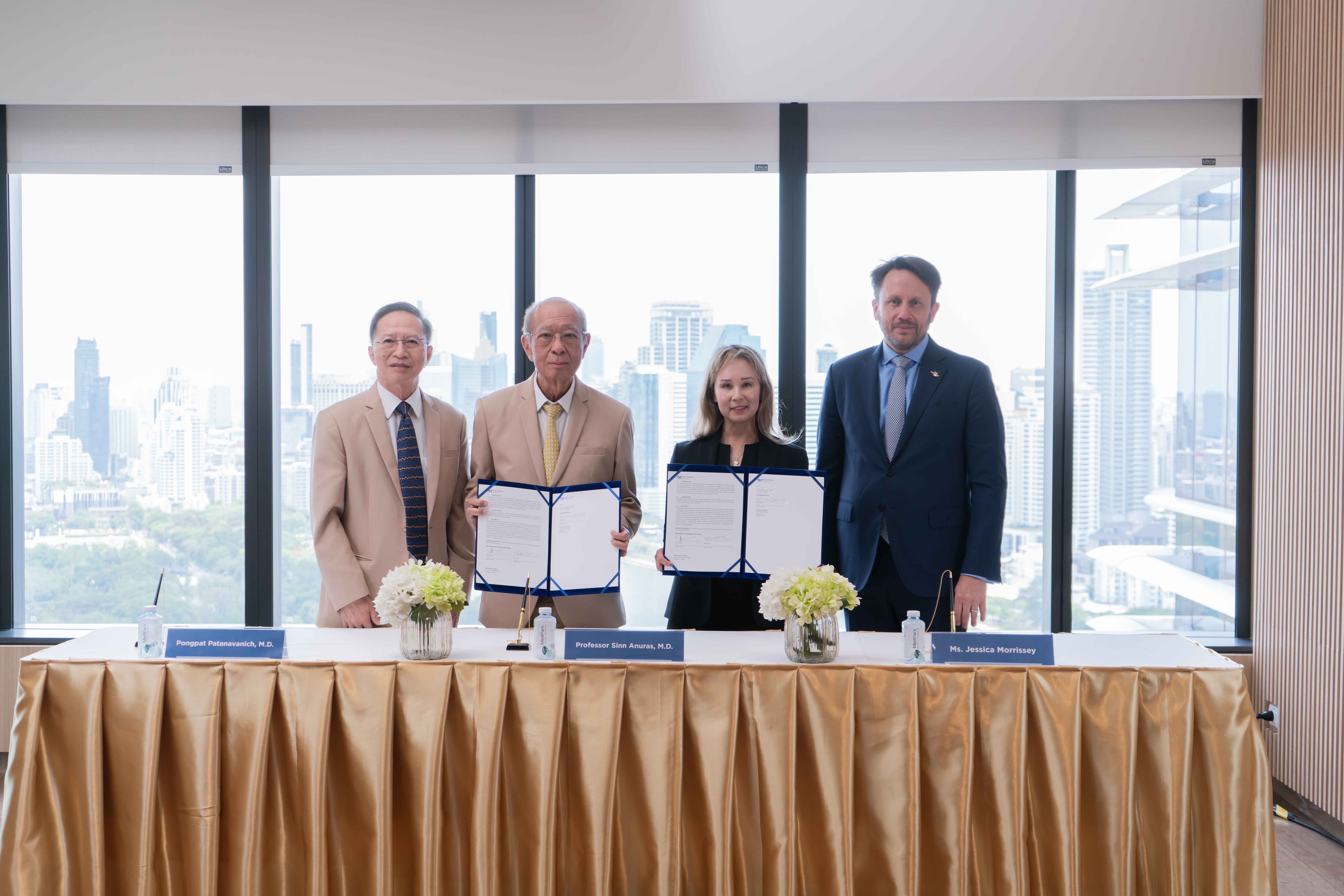 กรุงเทพ, 12 พฤษภาคม 2566 - ศาสตราจารย์ นพ.สิน อนุราษฎร์ และ นพ. พงษ์พัฒน์ ปธานวนิช ร่วมกับทีมผู้บริหารของโรงพยาบาลเมดพาร์ค ต้อนรับ นพ. แดเนียล เดอร์แมน รองประธานกรรมการฝ่ายบริหารฝ่ายแพทย์ นอร์ทเวสเทิร์น เมมโมเรียล และ นอร์ทเวสเทิร์น เมดดิซีน และ นางสาว เจสสิกา มอร์ริสเซย์ ประธานเจ้าหน้าที่ผู้อำนวยการฝ่ายพัฒนาสากลและผู้อำนวยการฝ่ายความสัมพันธ์ระหว่างประเทศของนอร์ทเวสเทิร์น เมดดิซีน ในพิธีลงนามบันทึกข้อตกลงความร่วมมือในการศึกษา การวิจัย การสังเกตการณ์ทางคลินิก รวมถึงการแลกเปลี่ยนแพทย์จากสหรัฐอเมริกามาให้คำปรึกษาแก่ผู้ป่วยของเมดพาร์ค
