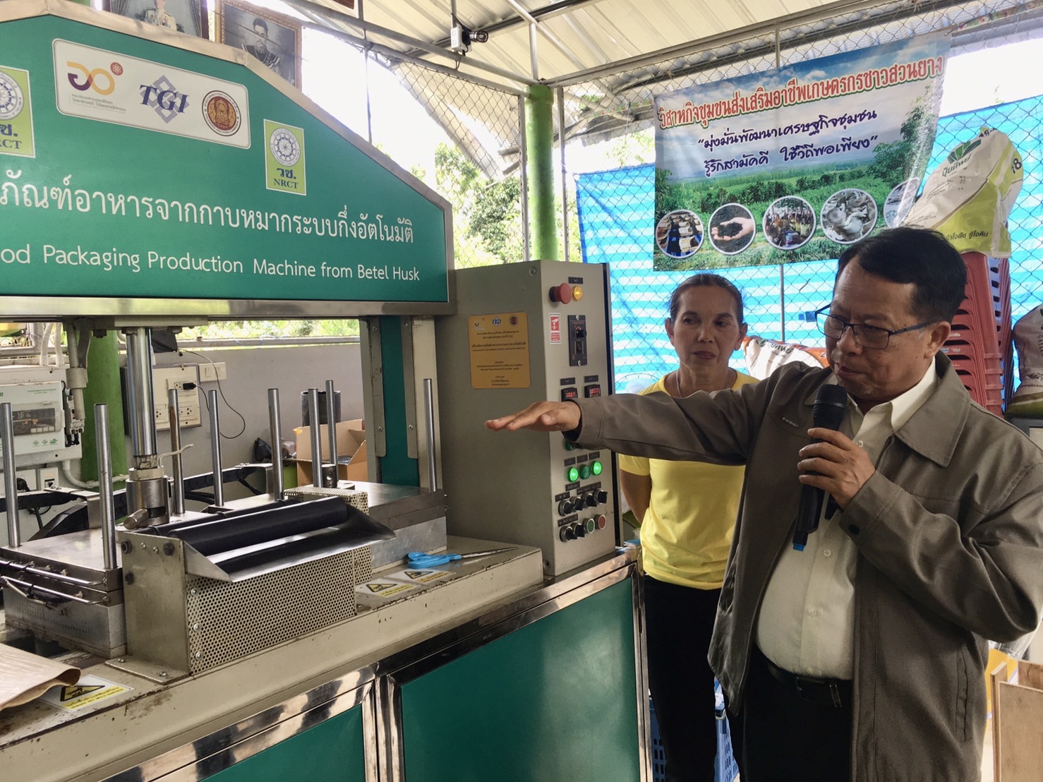 นายธเนศ ศรีรุ่งเรือง นายกองค์การบริหารส่วนตำบลท่าอุแท กล่าวว่า รู้สึกยินดีเป็นอย่างยิ่งที่ วช. นำครื่องผลิตบรรจุภัณฑ์อาหารจากกาบหมากระบบกึ่งอัตโนมัติ มามอบให้ ทำให้กลุ่มวิสาหกิจชุมชนส่งเสริมอาชีพเกษตรกรชาวสวนยางมีอาชีพ มีรายได้เพิ่มขึ้น นอกจากการปลูกสวนยาง ปาล์มน้ำมัน และทุเรียน ด้วย