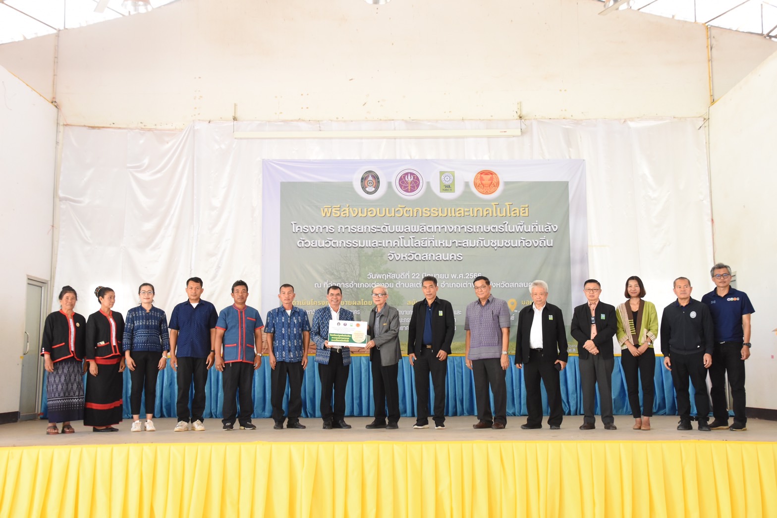 สำหรับนวัตกรรมที่ทำการส่งมอบในครั้งนี้ แบ่งเป็นการส่งมอบให้กับวิสาหกิจชุมชน 3 แห่ง ประกอบด้วย 1. กลุ่มวิสาหกิจชุมชนกลุ่มอนุรักษ์และฟื้นฟูข้าวพันธุ์พื้นเมือง “หอมดอกฮัง” บ้านโคกสะอาด ตำบลอุ่มจาน อำเภอกุสุมาลย์ จังหวัดสกลนคร รับมอบนวัตกรรม ดังนี้ 1) สถานีสูบน้ำพลังงานเซลล์แสงอาทิตย์ จำนวน 1 สถานี 2) รถไถไฟฟ้านั่งขับอเนกประสงค์ จำนวน 1 ชุด 3) เครื่องปักดำขนาดเล็ก แบบ 4 แถว ใช้ต้นกล้าล้างราก จำนวน 1 เครื่อง 4) เครื่องทำความสะอาดเมล็ดพันธุ์ข้าวเปลือกและคัดแยกข้าวกล้อง จำนวน 1 เครื่อง 5) หัวเชื้อจุลินทรีย์ท้องถิ่นที่ใช้ในการปรับปรุงดิน 2. กลุ่มวิสาหกิจชุมชนเกษตรสุขใจสมุนไพรไทเต่างอย บ้านโพนปลาโหล ตำบลเต่างอย อำเภอเต่างอย จังหวัดสกลนคร รับมอบนวัตกรรม ดังนี้ 1) โรงงานเคลื่อนที่แบบตัวต่อพร้อมเครื่องจักรแปรรูปมาตรฐาน GMP จำนวน 1 โรงงาน 2) การพัฒนาบรรจุภัณฑ์ใหม่ จำนวน 2 ผลิตภัณฑ์ 3) หัวเชื้อจุลินทรีย์ท้องถิ่นที่ใช้ในการปรับปรุงดิน 4) แปลงปลูกสมุนไพรที่มีมาตรฐานและมีสารสำคัญสูง และ 3. กลุ่มวิสาหกิจชุมชนสมุนไพรไทหนองบัว บ้านหนองบัว ตำบลบึงทวาย อำเภอเต่างอย จังหวัดสกลนคร รับมอบนวัตกรรม ดังนี้ 1) โรงเรือนปลูกพืชอัจฉริยะควบคุมสภาพอากาศแบบเลือกชนิดพืชได้ จำนวน 1 โรงเรือน 2) เครื่องอบอเนกประสงค์พลังงานเซลล์แสงอาทิตย์เคลื่อนที่ได้ จำนวน 2 เครื่อง 3) การพัฒนาบรรจุภัณฑ์ใหม่ จำนวน 1 ผลิตภัณฑ์ 4) หัวเชื้อจุลินทรีย์ท้องถิ่นที่ใช้ในการปรับปรุงดิน 5) แปลงปลูกสมุนไพรที่มีมาตรฐานและมีสาระสำคัญสูง โดยนวัตกรรมที่ได้จากโครงการนี้มีส่วนสำคัญอย่างยิ่งในการเพิ่มผลผลิตทางการเกษตรด้วยเทคโนโลยีและนวัตกรรม การแปรรูปผลผลิตทางการเกษตร การพัฒนาบรรจุภัณฑ์ การเพิ่มช่องทางการจัดจำหน่าย การพัฒนาสื่อเพื่อการรับรู้การเข้าถึงนวัตกรรมและเทคโนโลยี รวมทั้งการติดตามและประเมินผล เพื่อพัฒนาอาชีพและสร้างรายได้ให้กับชุมชนกลุ่มเป้าหมายอย่างยั่งยืนต่อไป