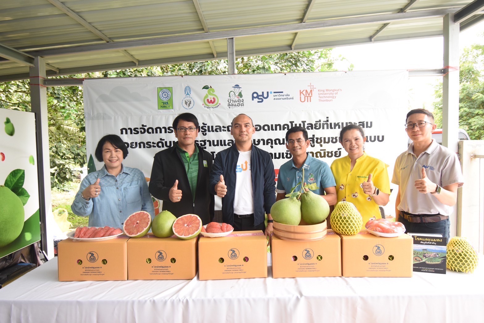 รศ.ดร.สมัคร แก้วสุกแสง รองอธิการบดีฝ่ายวิจัยและนวัตกรรม มหาวิทยาลัยทักษิณ หัวหน้าโครงการฯ กล่าวว่า วช. ได้สนับสนุนทุนวิจัย โครงการ “การจัดการความรู้และถ่ายทอดเทคโนโลยีที่เหมาะสมเพื่อยกระดับมาตรฐานและรักษาคุณภาพสู่ชุมชนต้นแบบการผลิตส้มโอทับทิมสยามเชิงพาณิชย์” เพื่อถ่ายทอดเทคโนโลยีการจัดการก่อนและหลังการเก็บเกี่ยวเพื่อรักษาคุณภาพและการยืดอายุการเก็บรักษาส้มโอทับทิมสยาม สำหรับตลาดในประเทศและส่งออกให้กับกลุ่มเกษตรกร ชุมชนผู้ผลิตและบริษัทภาคเอกชนในพื้นที่อำเภอปากพนัง จังหวัดนครศรีธรรมราช รวมถึง พัฒนาคุณภาพส้มโอทับทิมสยามให้ได้มาตรฐานสำหรับตลาดในประเทศ Modern Trade และส่งออก สร้าง Learning and Innovation Platform ชุมชนต้นแบบการผลิตและการจัดการหลังเก็บเกี่ยวของส้มโอทับทิมสยาม ที่มีคุณภาพสูงที่ปลูกในเชิงพาณิชย์ภายใต้กลุ่มสหกรณ์การเกษตรปากพนัง ที่มีการเชื่อมโยงกับระบบการตลาด Modern Trade นอกจากนี้ ยังได้พัฒนาทักษะการผลิตและการจัดการหลังการเก็บเกี่ยวของส้มโอทับทิมสยามเชิงพาณิชย์ให้กับบุคลากรทางการเกษตรในท้องที่อำเภอปากพนัง จังหวัดนครศรีธรรมราช